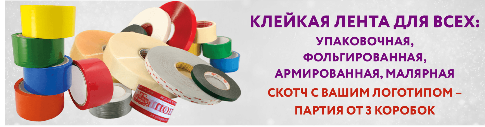- скотч в ассортименте – упаковочный, малярная лента, армированный, металлизированный, с нанесением вашего логотипа;
